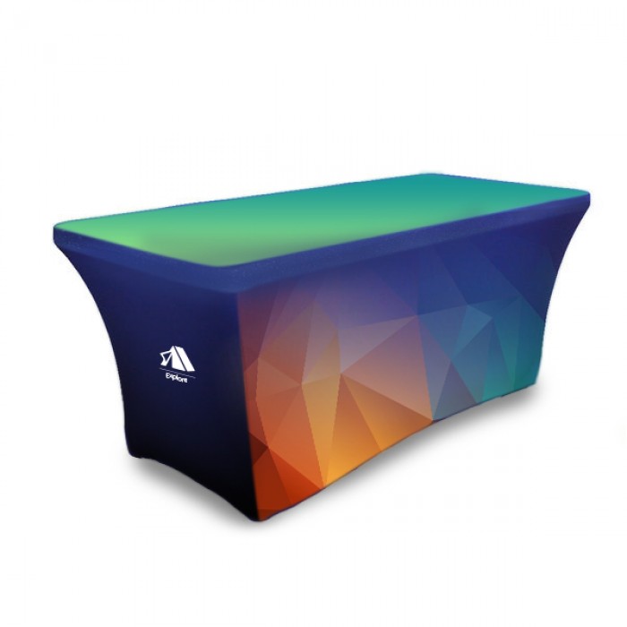 This modern update to the traditional table throw is sleek and eye-catching. The Stretch Table cover fits snug to most 8′ collapsible tables, perfect for a variety of tradeshows and events. The table cover is a fully customizable dye-sub graphic print. Canvas loops included securing the cover to each leg during install.